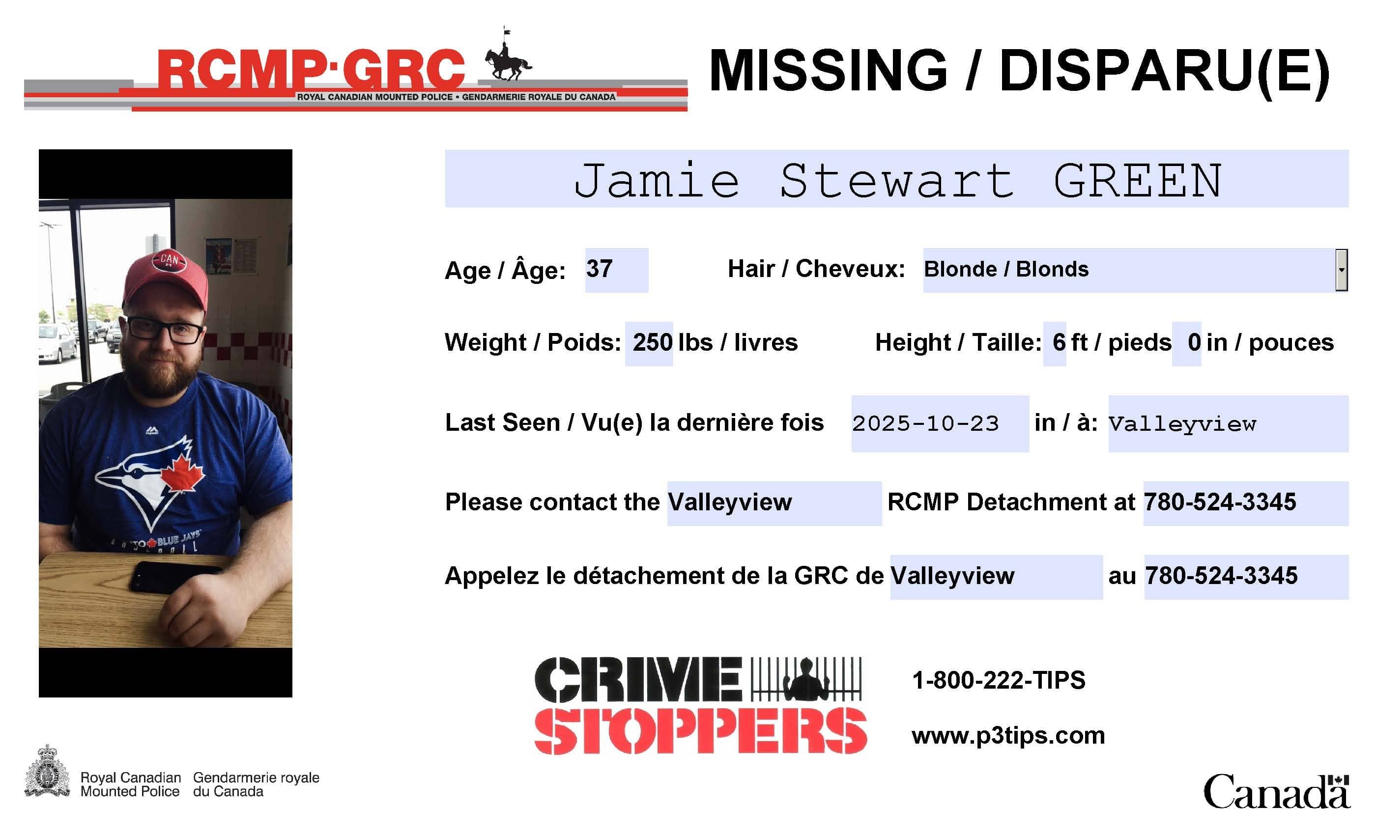 Valleyview RCMP are seeking public assistance in locating 37-year-old Jamie Green, last seen on October 22 at 11:30 a.m.