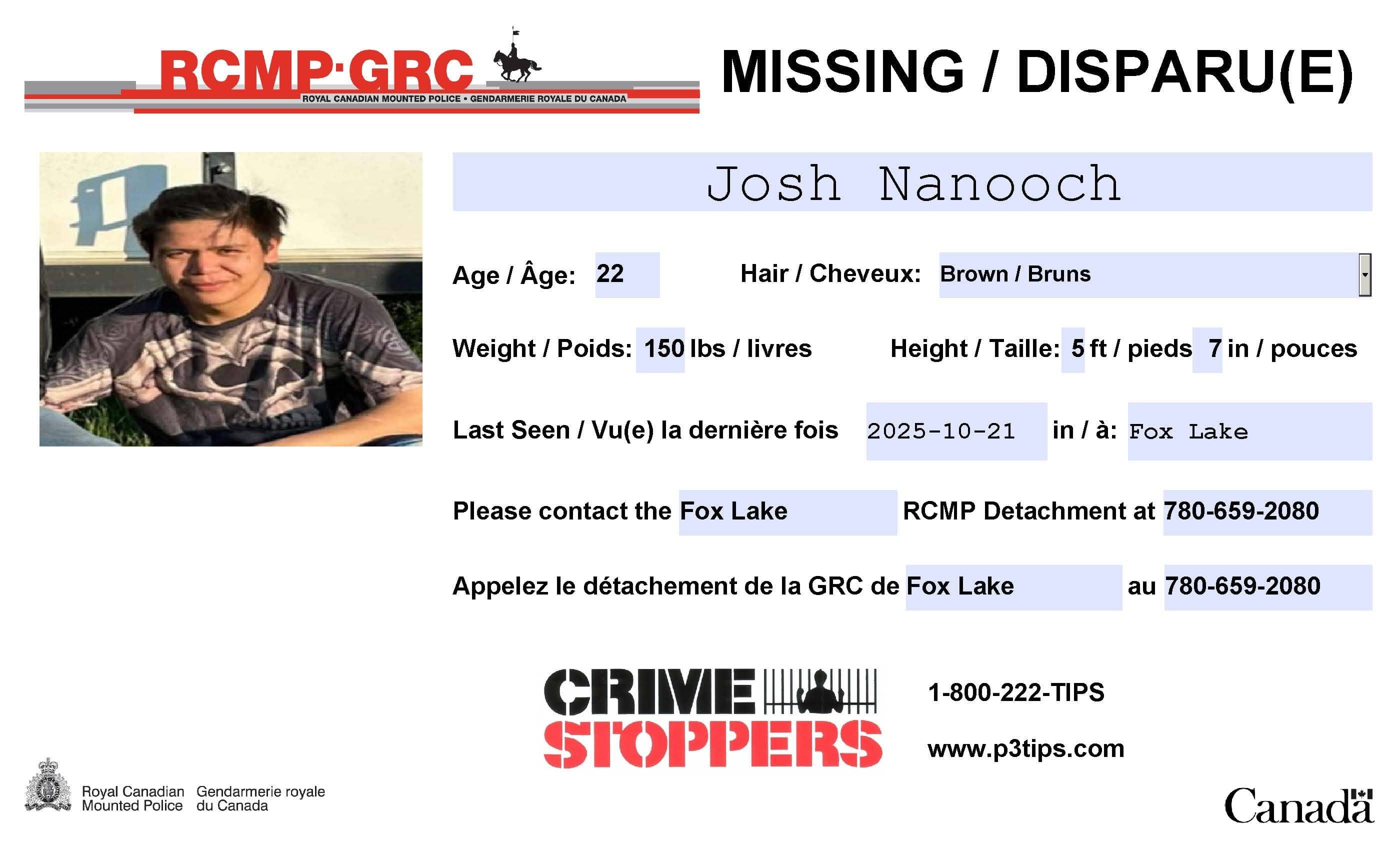 Fox Lake RCMP are seeking public assistance in locating 22-year-old Josh Nanooch, last seen on October 21 2025, in Fox Lake, Alberta.