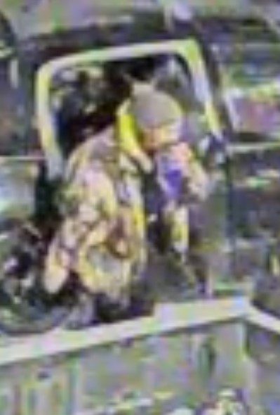 A passenger, wearing a grey or green toque, yellow sweater, purple bandana over the face, hunting-style jacket, and dark pants, exited the rear seat, entered the parked truck, and drove off as the suspect vehicle departed with its rear door still open.