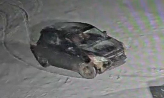 Survey footage shows a black or dark grey small hatchback, missing its front bumper, entering the site.