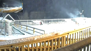 Both individuals are wearing all black clothing and their distance from the camera makes it hard to distinguish any features.