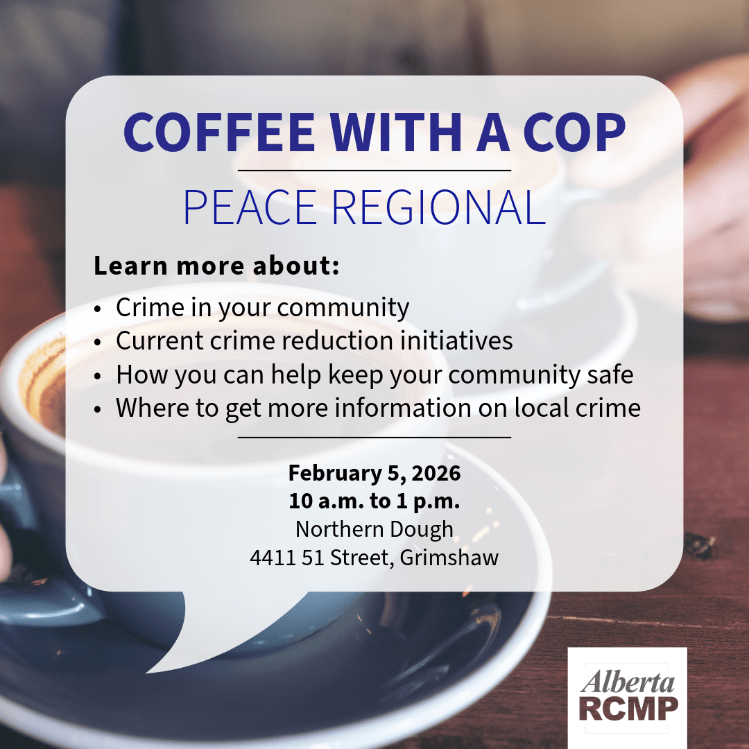 Coffee with a Cop returns to the area today from 10-1 at Northern Dough Bakery in Grimshaw.